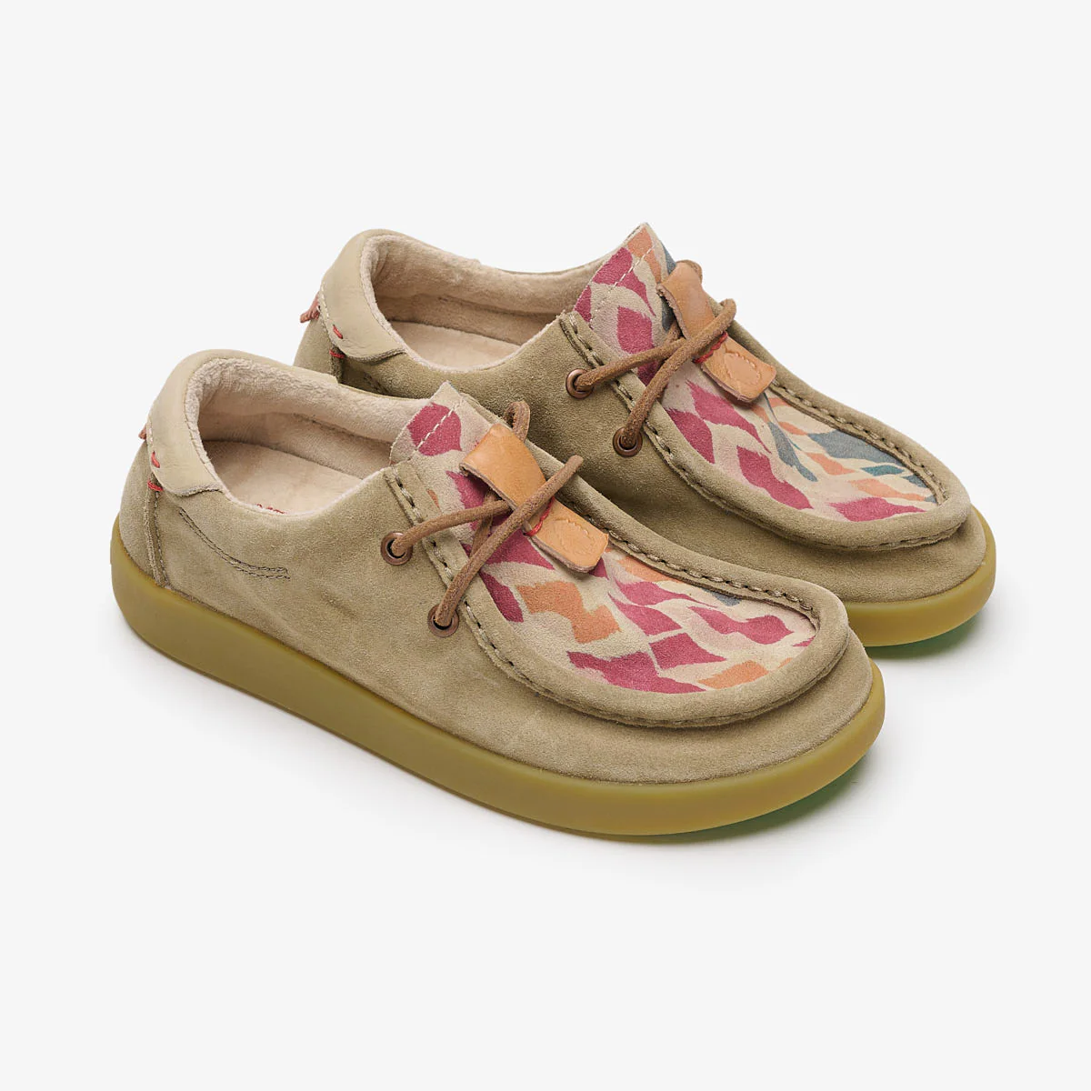 This playful version of winter Kwahu brings a vibrant ethnic touch thanks to a bold geometric print on the upper — full of personality, yet grounded in nature. Built in premium-quality suede and natural leather, it keeps the rustic soul of the original Kwahu while adding a more expressive and joyful look. The soft organic cotton lining with a velvet finish adds warmth and comfort for the colder months, while the natural leather laces and hand-finished details honour traditional craftsmanship.