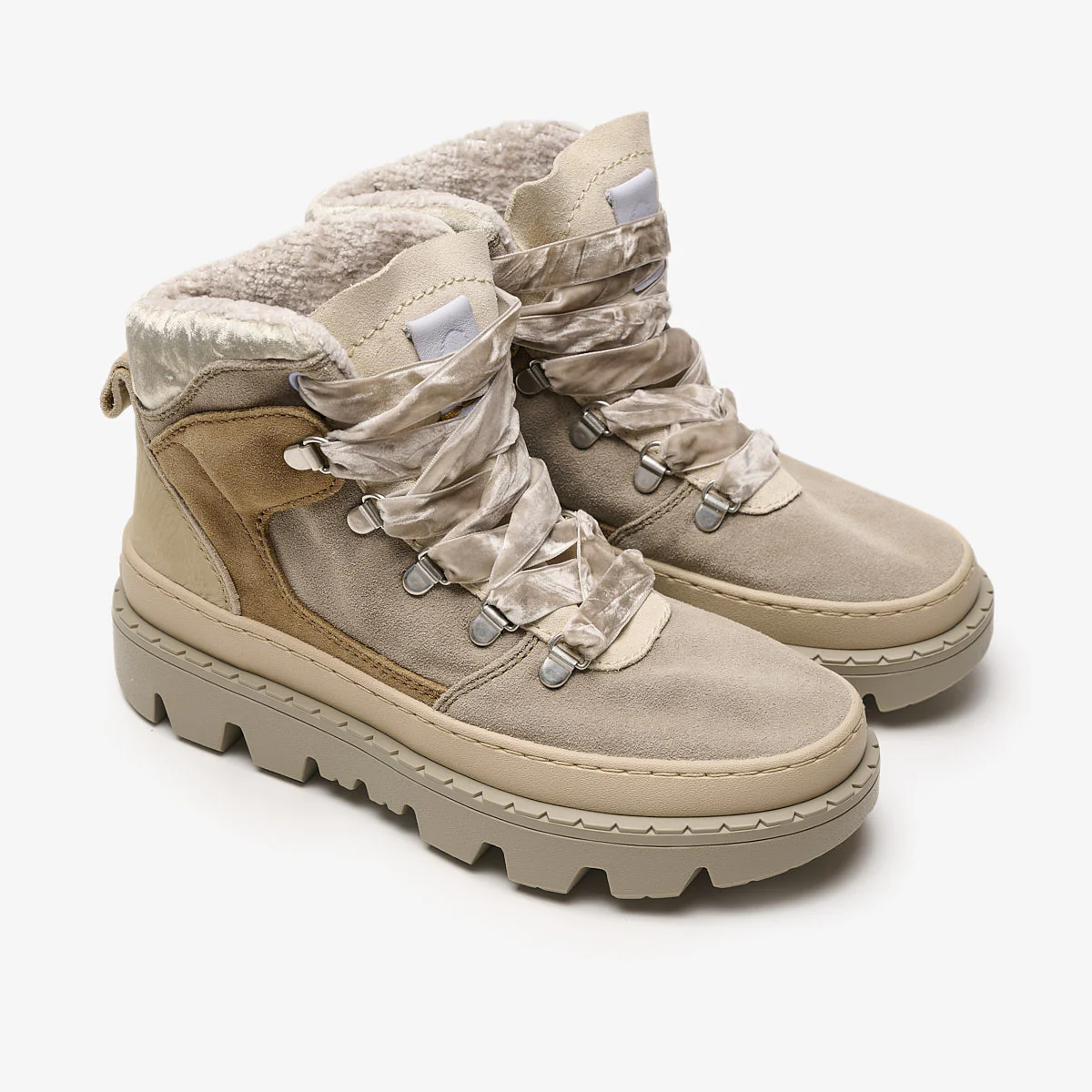 An urban boot with a sporty style and fantasy touches, inspired by classic mountain boots, constructed with top-quality materials and velour laces with vintage effect.